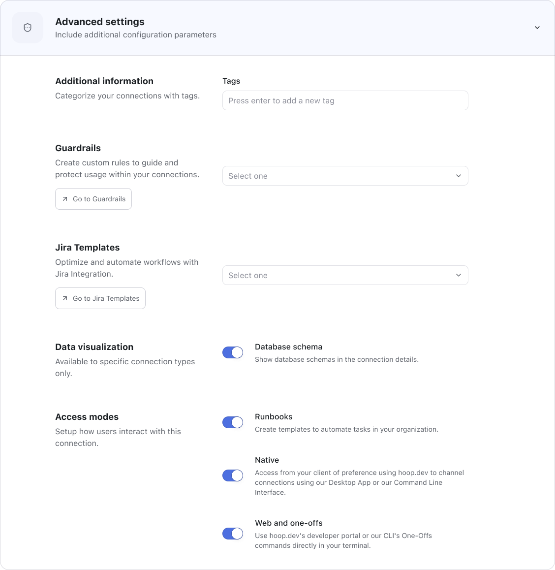 To get started, enable the Jira integration in the Integrations section of your Hoop.dev instance.For a step-by-step setup and advanced options, see Advanced Configuration.