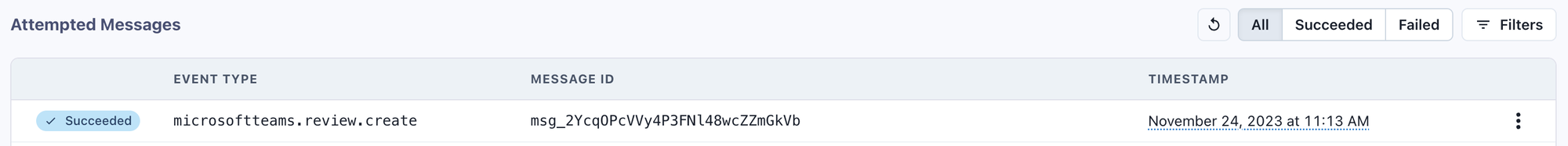 Go to the Testing tab, select the available event, and click on the Send Example button. This event should be received in the configured Teams channel. In the “Overview” tab, the test with the sent event will be displayed.