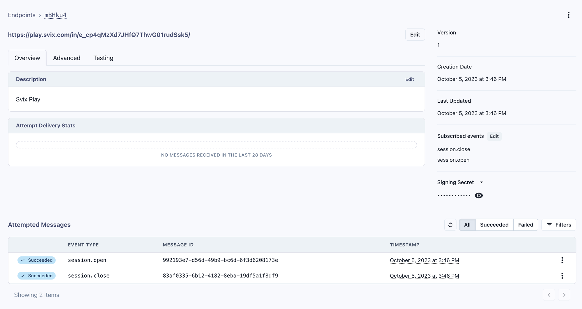 To route these messages to your SIEM, add your public endpoint that will receive these messages. Click on the Endpoints link.Adding endpoints to a self-hosted Svix instance is only available via svix command line or api.